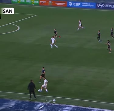 O mesmo erro ocorreu aos 35 minutos do segundo tempo, quando Laryh deixou Evelin na cara do gol, porém novamente a jogada foi parada pela marcação incorreta de impedimento da assistente. Na imagem, novamente, a atacante está muito atrás da última defensora do Botafogo. Foram erros idênticos em um intervalo de apenas 6 minutos.